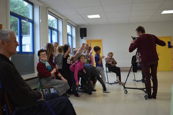 Onder leiding van danser Benjamin Vandewalle. Zoeken we naar raakpunten en tegenstellingen tussen de kinderen en de ouderen. Zowel voor de kinderen als voor de bejaarden werd het een unieke belevenis om samen te werken met een kunstenaar en met elkaar.